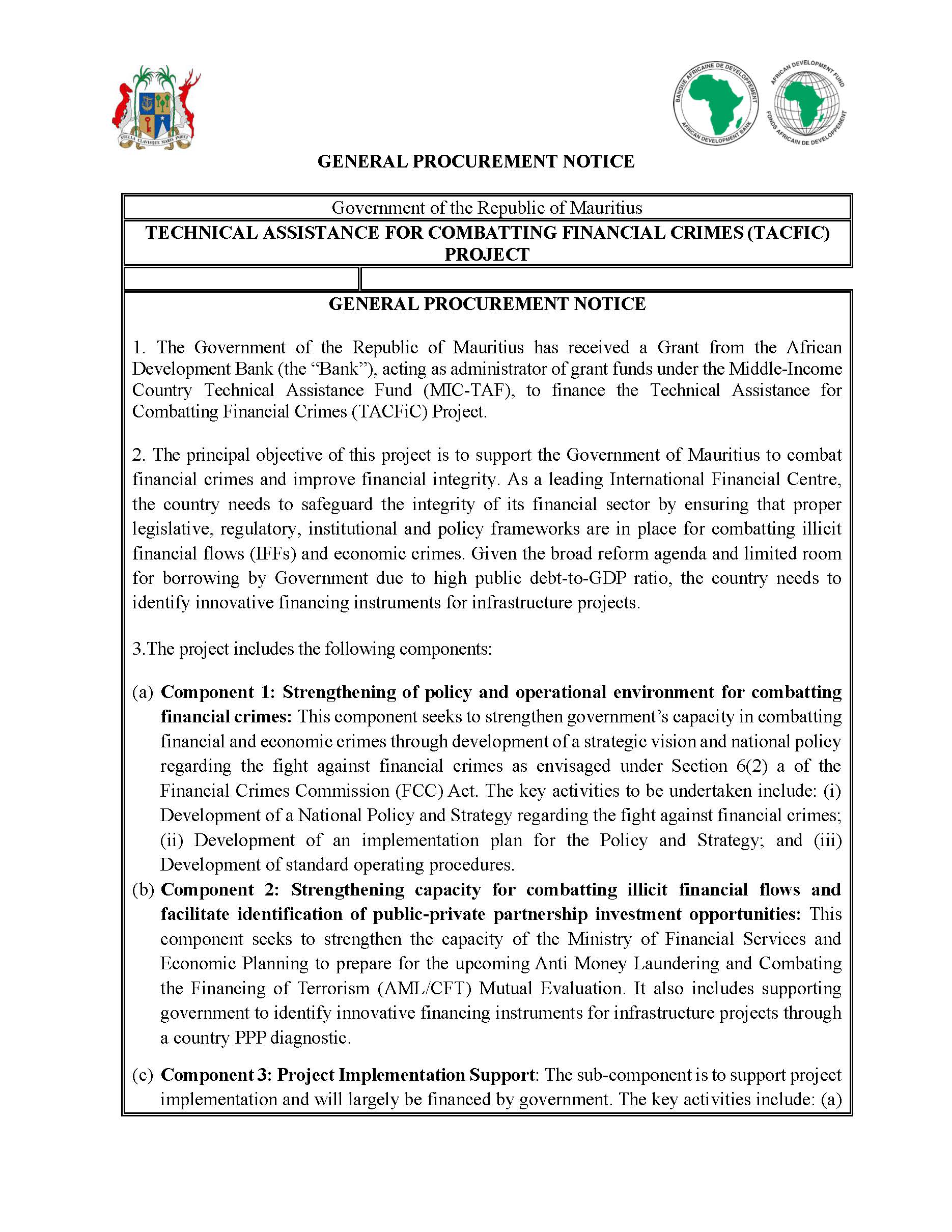 The Government of the Republic of Mauritius has secured a grant from the African Development Bank under the MIC-TAF to implement the Technical Assistance for Combatting Financial Crimes (TACFiC) Project.