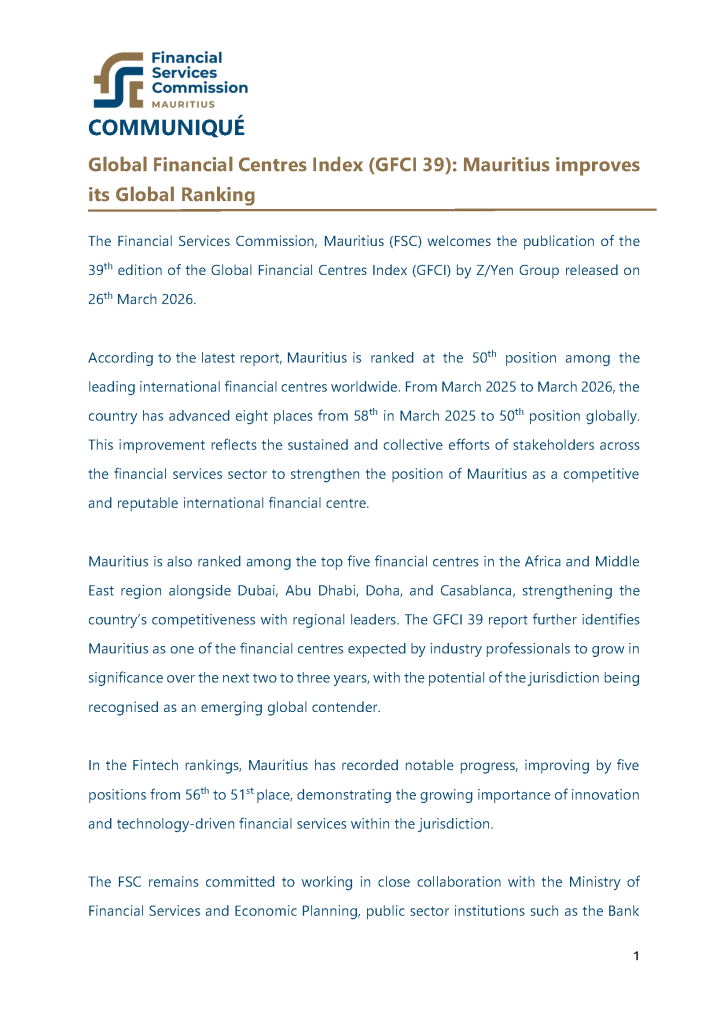 The Financial Services Commission Mauritius has welcomed the release of the 39th edition of the Global Financial Centres Index (GFCI 39) by Z/Yen Group on 26 March 2026, with Mauritius recording a notable improvement in its global standing.