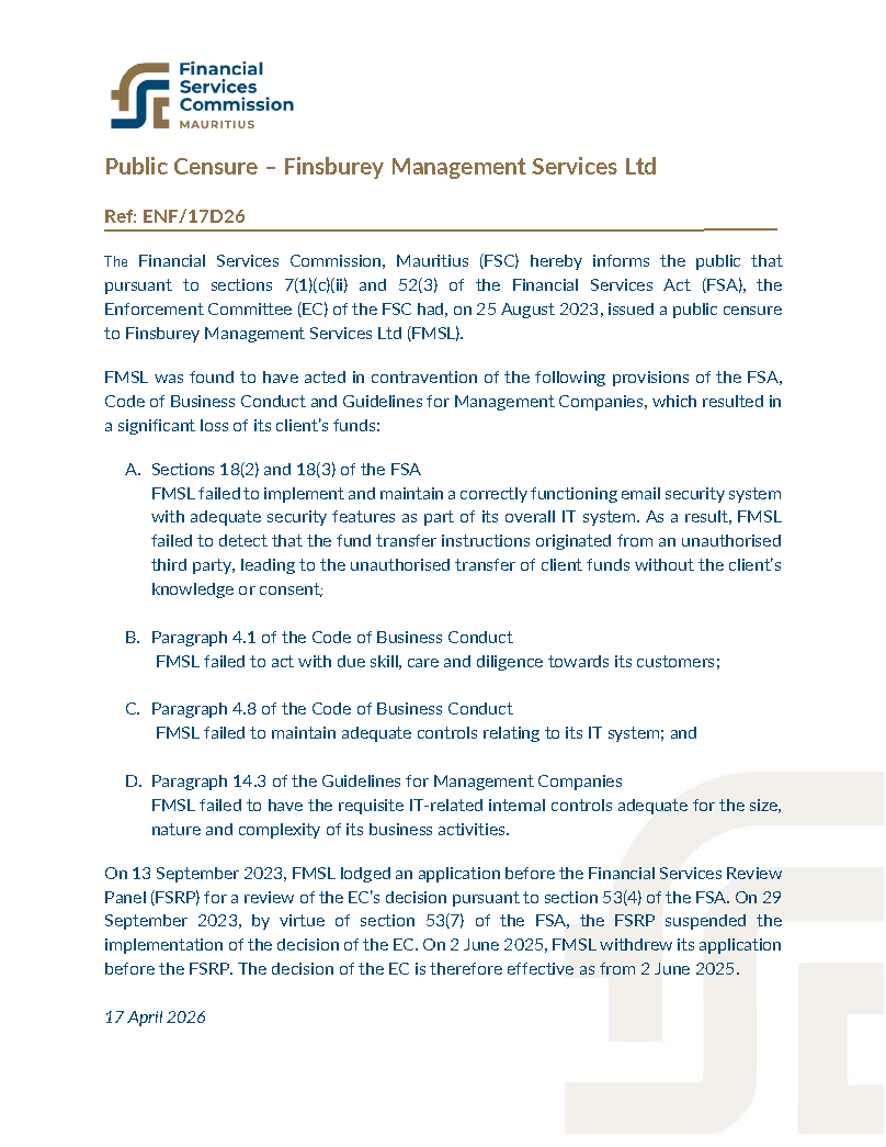 The Financial Services Commission (FSC) Mauritius has launched its Online Complaints Portal as from 16 March 2026, introducing a centralised mechanism for complaints across the financial services sector.